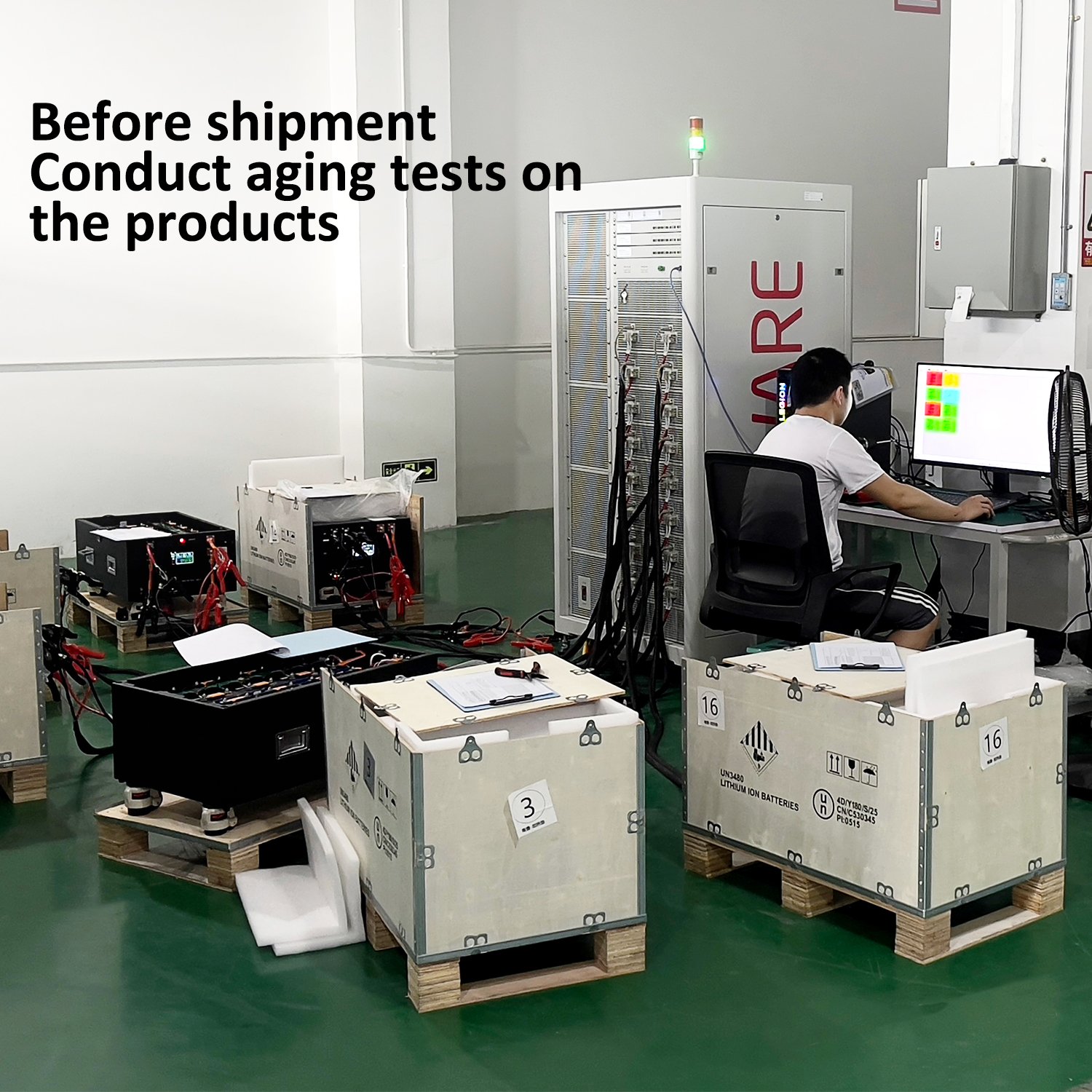 Advanced ATE testing equipment and aging rooms. We conduct charge/discharge tests and BMS installation verification.