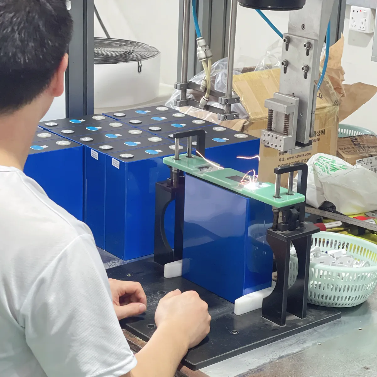 Modern battery pack production lines with precision welding studs and terminal pressing ensuring structural integrity.